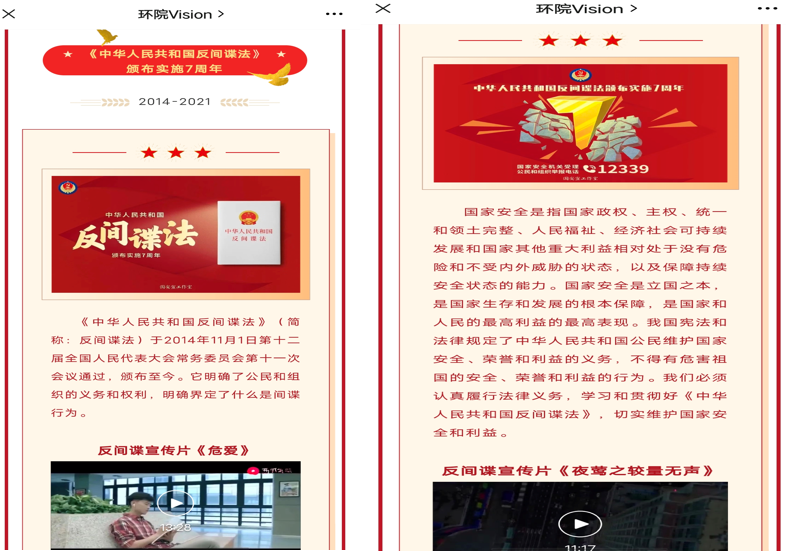 2021年11月1日是《中华人民共和国反间谍法》颁布实施7周年。为进一步提高全院师生维护国家安全及反间防谍意识,beat365手机版官网入口组织开展《中华人民共和国反间谍法》颁布实施纪念日宣传教育活动。