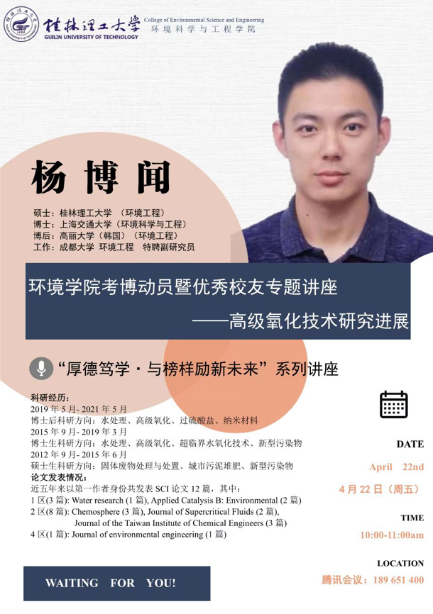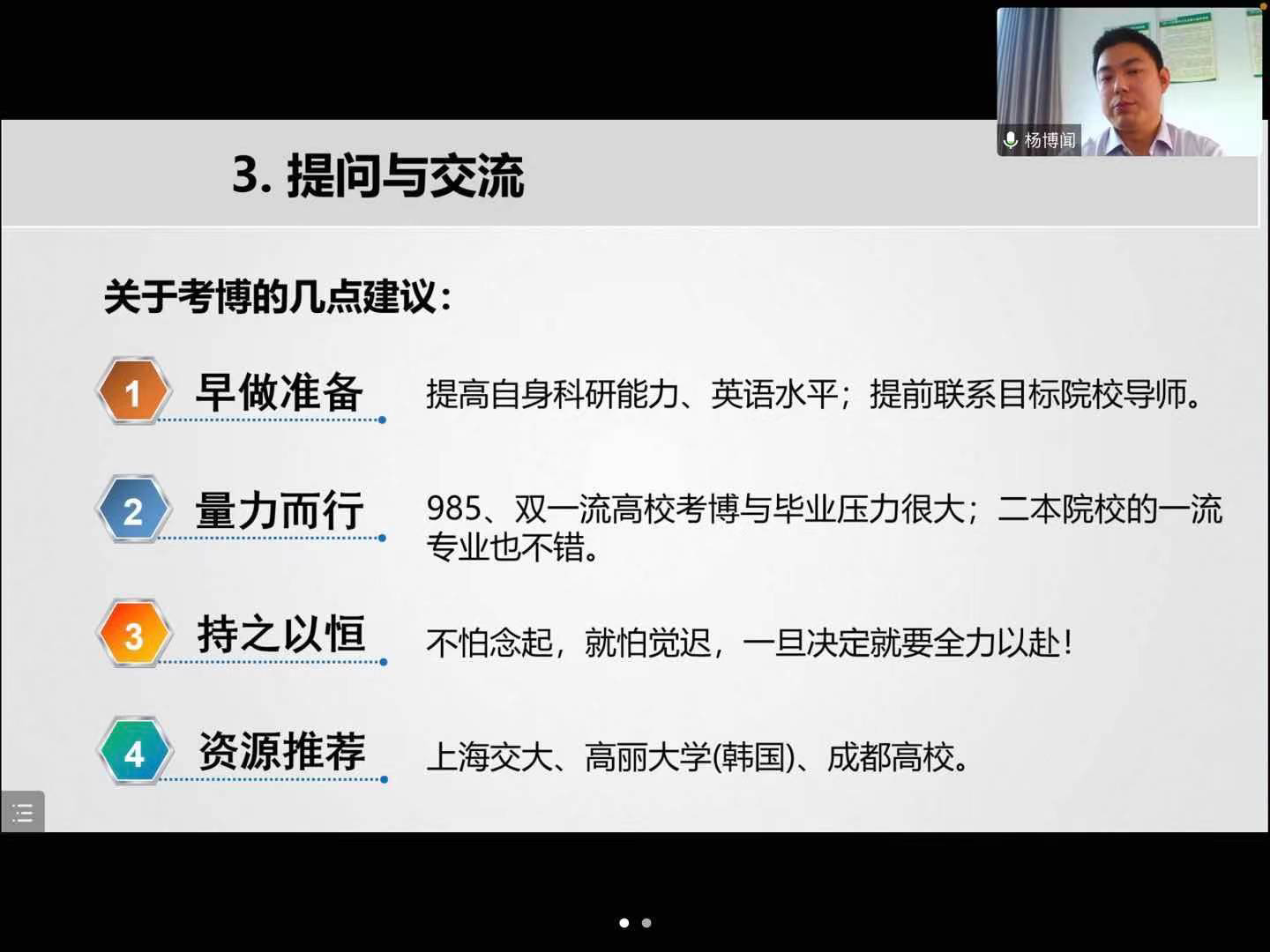 为营造良好的考博氛围,给广大硕士生提供全方位的考博指导,2022年4月22日上午,环境学院在腾讯会议线上举办“厚德笃学·与榜样励新未来”第一期考博动员系列讲座。本期特邀成都大学副研究员杨博闻老师作为主讲,学院李艳红副院长主持,156名硕士研究生参与了此次讲座。
