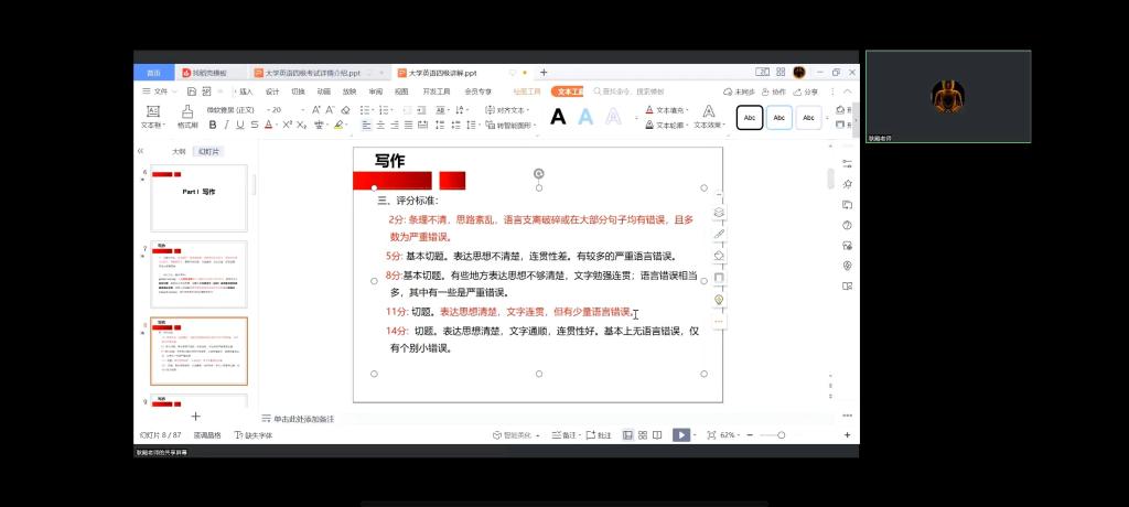 获得英语四级证书的重要性对于当代大学生来说不言而喻,无论是学校的要求还是个人今后发展都需要同学们具备英语四级甚至更高的能力。本堂在线课耿飙老师不仅给同学们点拨了考试时的做题技巧,更是利用多年研究英语四级考题的所得来的经验总结出几大类题型,制定应对策略,教同学们如何备考、斩获高分。课程最后,耿老师分析了汉英语言结构差异,让大家用语言结构的差异去打开做翻译题的思路,拒绝生搬硬套、死记硬背。