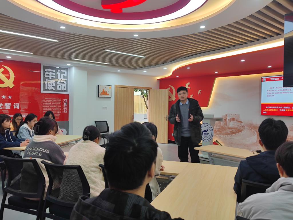为深入学习宣传贯彻党的二十大精神,引领我院广大青年学生坚定理想信念,坚定不移听党话、跟党走,切实把思想和行动统一到党的二十大精神上来,争做有理想、敢担当、能吃苦、肯奋斗的新时代好青年。2023年2月24日上午,学院学工办唐源江老师在“明园”一站式学生社区思政大讲堂,以“青春践行二十大”为主题进行了学院示范主题班会。学院党委书记姜子亮、副书记郝文佳及全体辅导员、班主任代表出席示范主题班会。