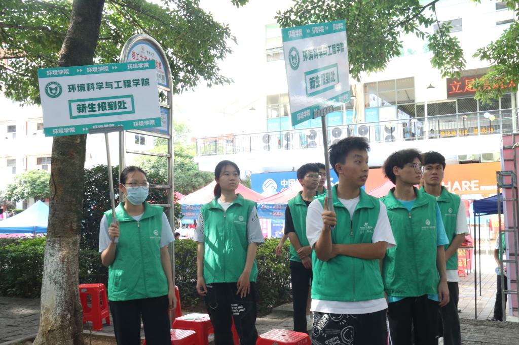 在接待点处,我院受助学生身着统一的志愿者服装,手握引导牌整齐划一地站在校车停放点,迎接即将步入校园的23级新生及家长们。志愿者们主动为新生提拉行礼、提供校园导览、指引报到流程、答疑解惑,展现出我院受助学生的良好风貌。