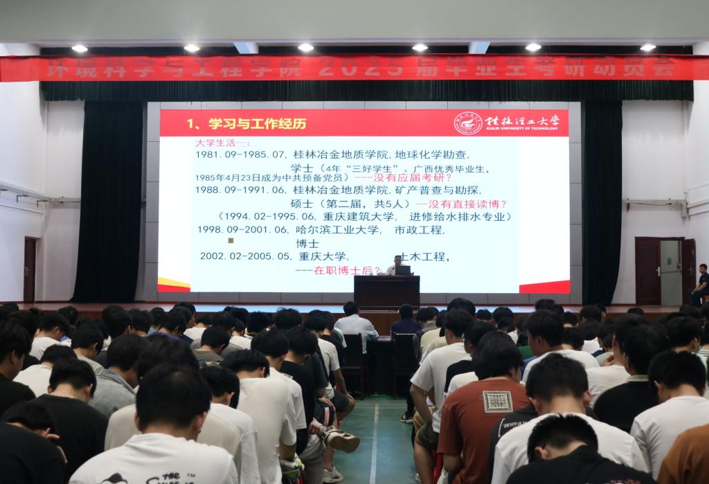 为进一步加强学风建设,激发广大学生的考研热情,营造良好的学习氛围,5月22日晚,我院邀请学校原党委书记张学洪教授在雁山校区风雨操场举办2025届毕业生考研动员大会,学院副院长李海翔、朱宗强,学院党委副书记叶大相出席会议,相关辅导员及全体2021级本科生共计400余人参加,会议由叶大相主持。