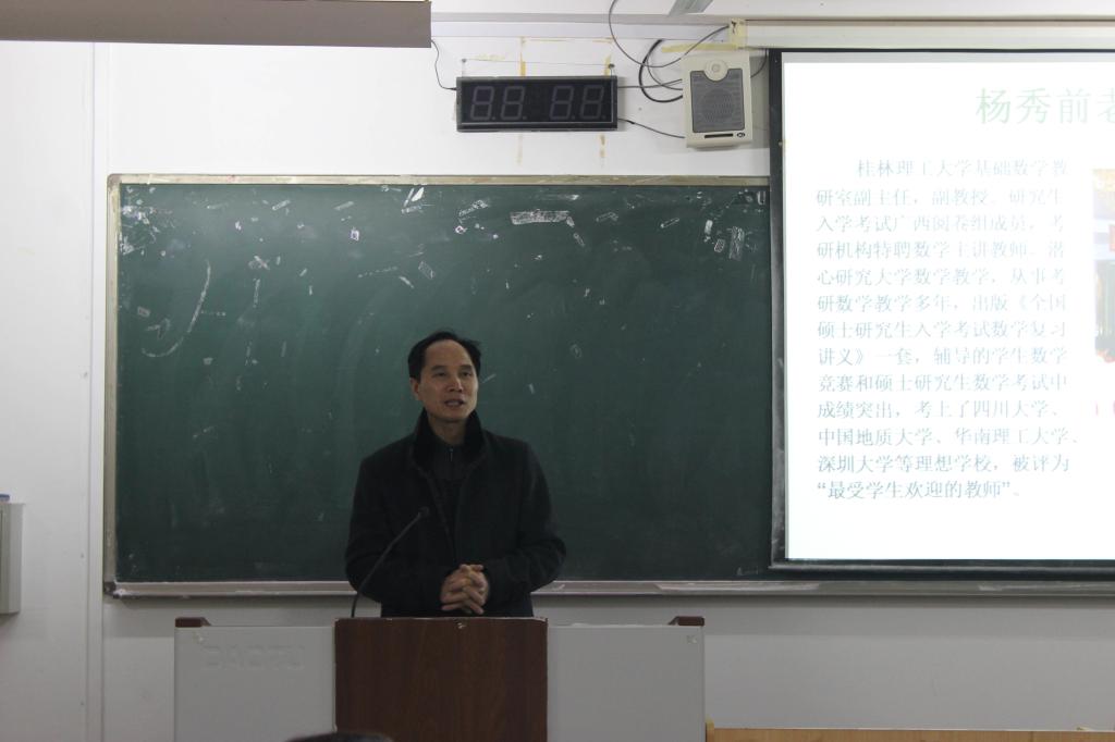 为增强学生考研信心,帮助考研同学更有效地针对性练习,2015年11月12日晚7点,我院特邀我校基础数学教研室副主任、副教授、研究生入学考试广西阅卷组成员杨秀前老师于雁山校区06301教室为我院考研同学进行数学指导讲座。