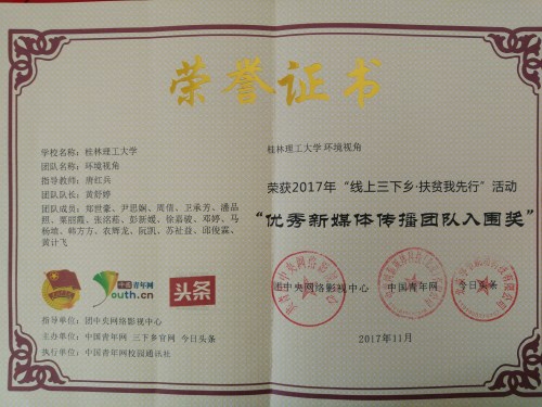 近日,由团中央网络影视中心、中国青年网、今日头条联合主办的党的十九大精神进校园网络作品征集活动启动仪式暨2017年“镜头中的三下乡”、“线上三下乡·扶贫我先行”、“三下乡”直播评选活动总结会在北京成功举行。会上,我院“环境视角”调研组在全国250余所大中专院校的1290余支实践团队中脱颖而出,荣获“优秀新媒体传播团队入围奖”。