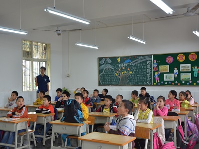 当天下午三点,义务支教队伍到达三合小学。在经过简单的熟悉学校和做好备课准备之后,本次支教活动有序的拉开了帷幕。本次支教分为两组团队,分别面向低年级和高年级组。开始,志愿者们因支教经验不足而略显羞涩和紧张,随着交流的增多,志愿者们的热情也愈发高涨,与小朋友们的相处也更加和谐。而后,志愿者们通过讲解PPT、观看动画视频、做游戏等相关内容,使小朋友们对环保知识有进一步的了解,并通过一问一答的方式,让小朋友们懂得了废品分类的重要性。将环保知识与游戏相结合,使小朋友们在玩的过程中学到了保护环境,人人有责的美德。志愿者们的讲解幽默风趣,深入浅出,课堂气氛活跃融洽,小朋友们在轻松愉快的氛围中,学习了丰富有趣的环保知识,了解到更多有益环保的事物。临近支教的尾声,志愿者们发放了我院专属环保小黄袋,并进行了合影留念。