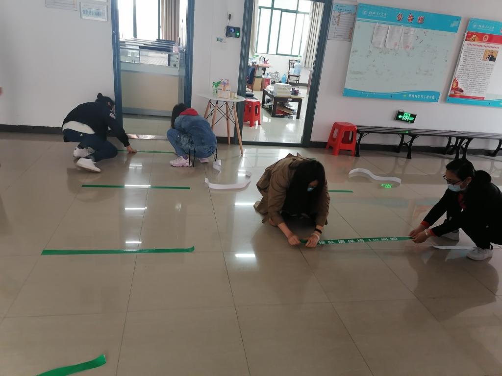 根据学校疫情防控工作部署和要求,为进一步做好学生返校后的教学工作,我院两办于4月20日上午在12栋萃华楼的4楼,按照分区域、保持1米距离、分设出入口等要求,进行测温线路设计,拉起警戒线,增设地面引导标识和出入口标识,并准备了免洗消毒液和一次性口罩等防疫用品。为学院师生营造安全的学习和工作环境。