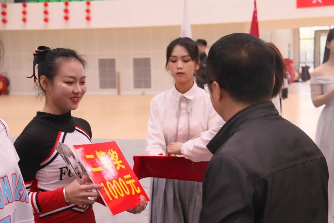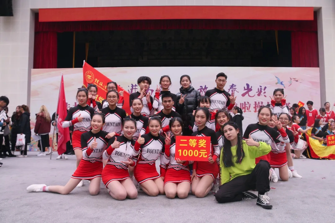 我院啦啦操队(Team Fountain)第五个出场,由20名不同年级学生组成,一出场便以青春活泼的造型吸引了观众的目光。队员们有力的动作和高超的技艺使得观众席上欢呼声此起彼伏,一场表演下来,将队员们强硬的实力完美表现。