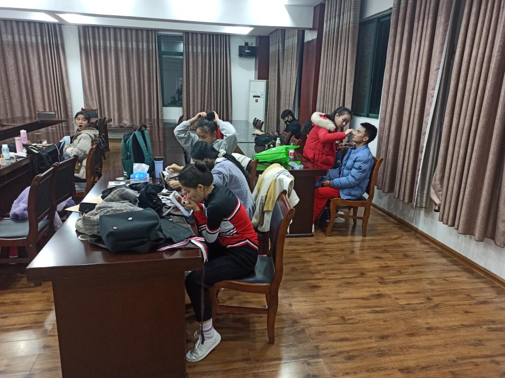 早上五点,啦啦操队员们就在12407集合,开始了紧锣密鼓的比赛准备。化妆、彩排、做发型,调整服装......