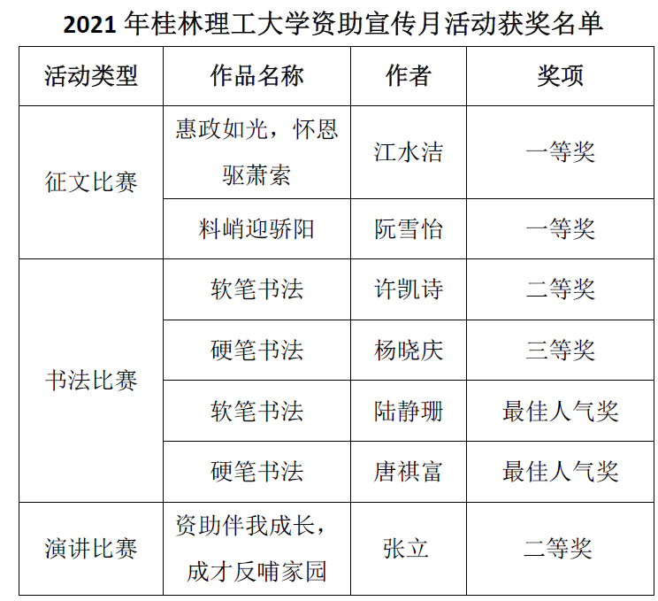 近日,beat365手机版官网入口主办的2021年“学生资助政策宣传月”系列活动公布获奖结果,我院在此次活动中喜获多项荣誉。征文比赛获得一等奖一项;书法比赛获得二等奖一项、三等奖一项、最佳人气奖两项;演讲比赛获得二等奖一项。