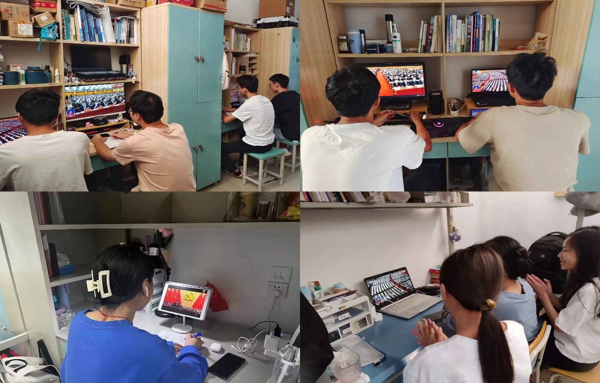 当习近平总书记等中央领导同志步入人民大会堂主席台,全体师生正襟危坐、全神贯注,认真聆听习近平总书记气势恢宏、慷慨激越的报告,共同见证这一伟大的历史时刻,共同感受团结奋进、一往无前的时代脉搏。学院师生聚精会神听报告,与北京声息相通、同频共振。报告结束时,大家情不自禁地鼓掌,展开热烈讨论。