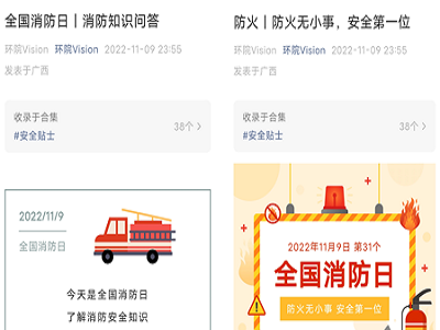 2022年11月9日是第31个全国消防日,11月为消防宣传月,为进一步贯彻落实《自治区教育厅关于开展2022年全区教育系统消防宣传月活动的通知》(桂教安稳〔2022〕47号)和学校消防宣传活动月工作要求,提升学生消防安全意识和逃生自救能力,学院结合当前火灾防控形势及疫情防控特殊时期,充分利用《大学生成长成才教育课》、学院新媒体平台、“一周一抽查、一月一联查”、LED屏等多种形式开展线上线下消防宣传教育活动。