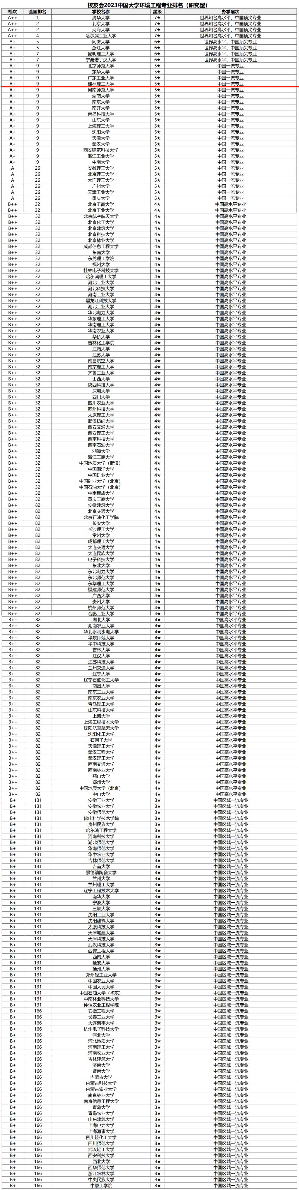 校友会2023中国大学环境工程专业排名(研究型)榜单显示,我院环境工程专业星级被评为5★,档次被评为A+,位列全国第9(全国约有400家高校设置环境工程专业)。
