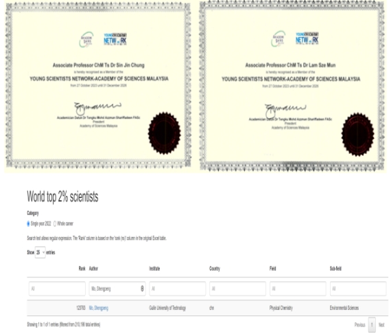 我院教师莫胜鹏、外籍教师蓝丝敏和辛恁宗3人入选2023年度全球前2%顶尖科学家榜单;外籍教师蓝丝敏和辛恁宗成功入选马来西亚青年院士