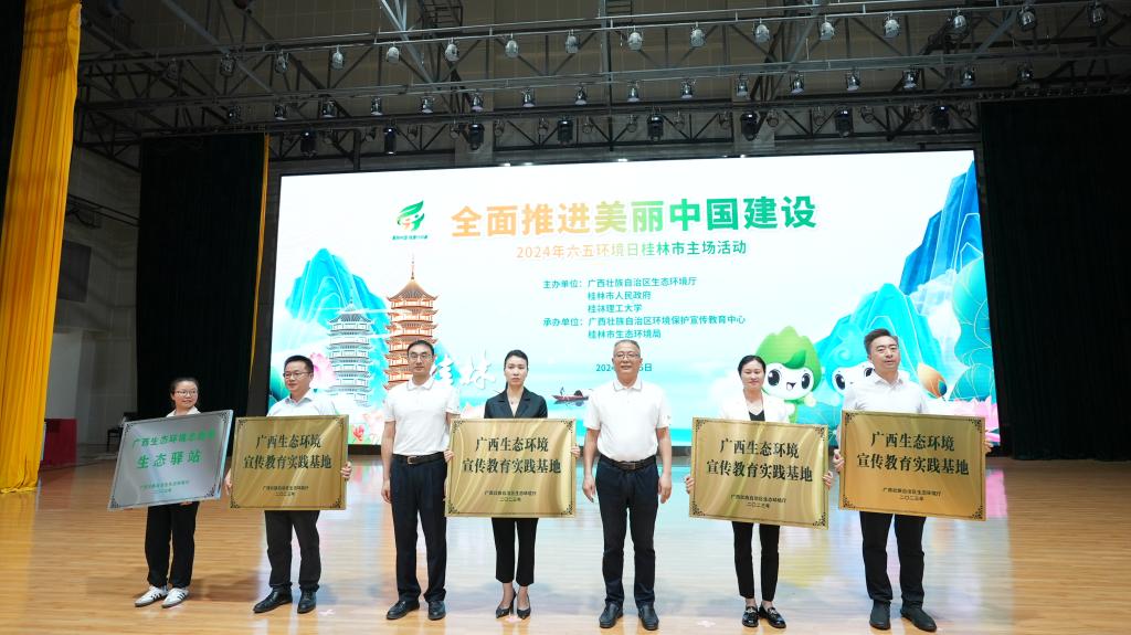 为自治区环境保护与生态文明建设先进集体、广西生态环境宣传教育实践基地、广西大学生环保科普创意大赛获奖学生授匾颁奖