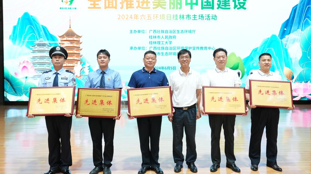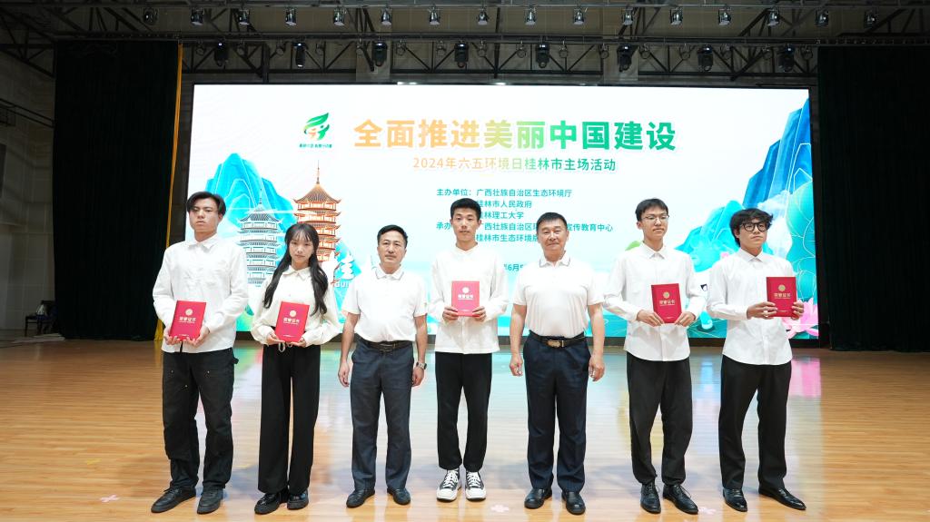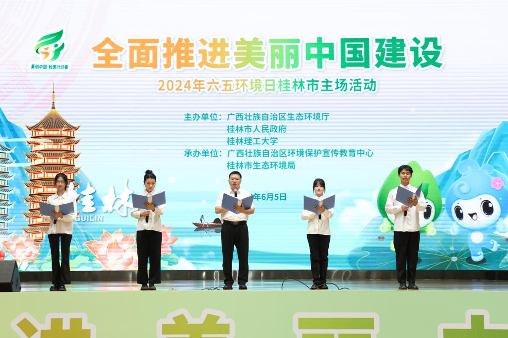 在第53个世界环境日到来之际,6月5日上午,由自治区生态环境厅、桂林市人民政府、beat365手机版官网入口主办的全面推进美丽中国建设——2024年六五环境日桂林市主场活动在我校雁山校区综合体育馆举行。桂林市人民政府二级巡视员周作智,我校校长王敦球,党委常委、宣传部部长叶昊,桂林市生态环境局局长张晓阳,自治区桂林生态环境监测中心主任蒋永光出席活动,桂林市相关部门负责人,有关企业代表,获奖代表,我校相关部门负责人、师生代表,媒体记者,桂林市环保社会组织、环保志愿者代表约350余人参加本次活动。