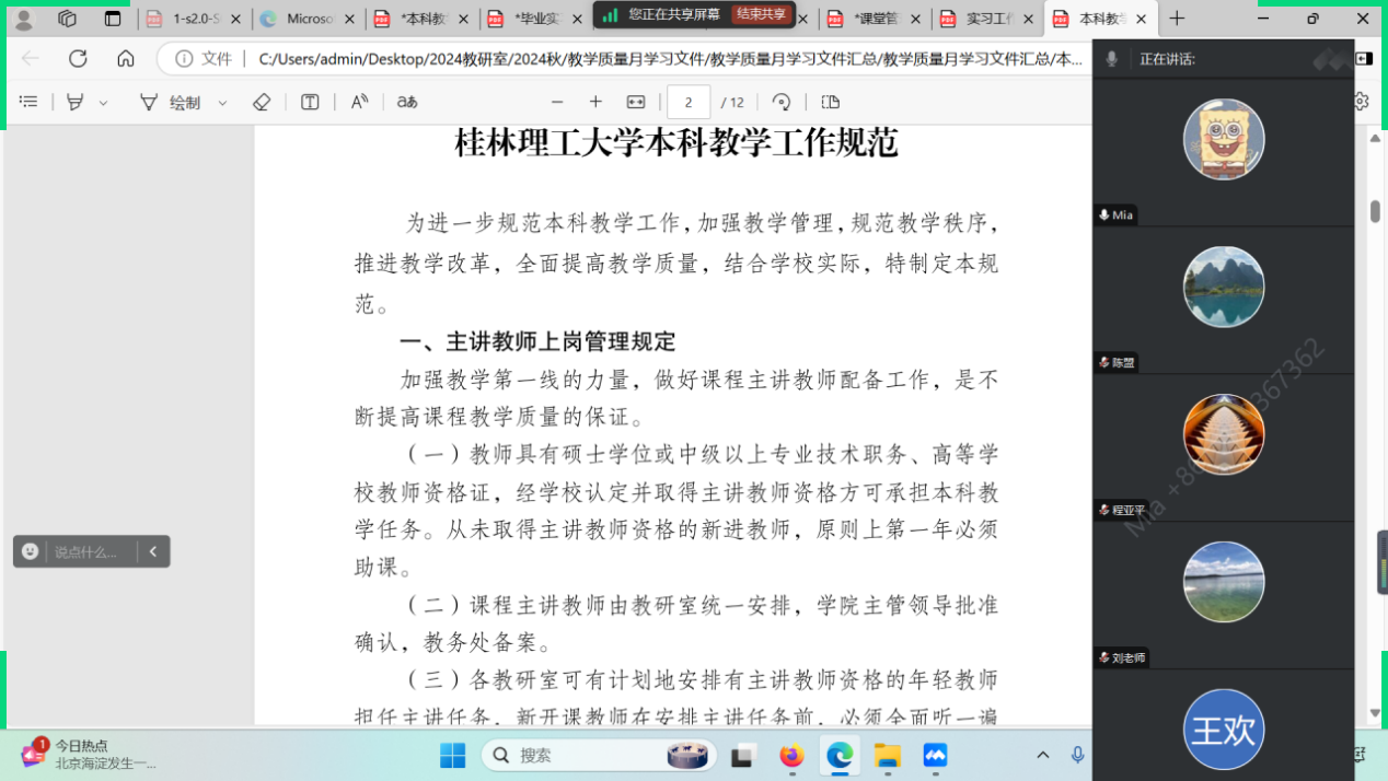 2024年11月1日,beat365手机版官网入口地下水科学与工程教研室开展了2024秋本科教学管理制度专题学习交流会议。会议内容涵盖了教学工作规范、课堂管理规定、考试管理规定、毕业实习和毕业设计工作规范等多个方面。就如何更好地执行和完善这些规范,教研室全体教师通过线上、线下进行多次深入讨论和交流,旨在全面提高日常教学工作的规范性和实效性。