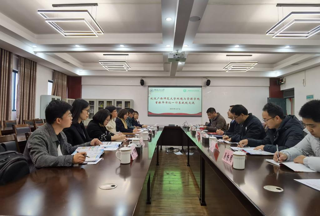 2025年元月7日下午,广西师范大学环境与资源学院党委书记曾振华、院长温桂清一行7人,到访我院参观交流。座谈会由学院党委书记代武社主持,院长曾鸿鹄、副院长黄亮亮、朱宗强及环境工程教研室主任参加了本次交流会。