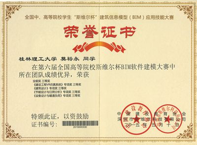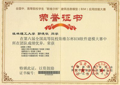 由我院2012级给排水科学与工程专业学生组成的“创新”队参加了于2015年5月9-10日举行的第六届全国中、高等院校学生“斯维尔杯”建筑信息模型(BIM)应用技能大赛决赛。获得了4个专项(建筑工程VR仿真系统、建筑设计、节能设计与日照分析、设备设计与暖通负荷)三等奖,1个全能三等奖的好成绩。