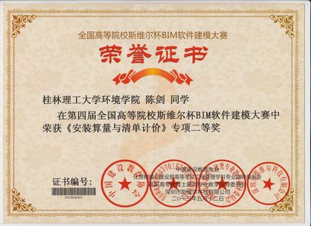 我院给水与排水工程专业罗柳丹、李科宇等9名同学晋级第四届全国高校斯维尔杯BIM软件建模总决赛。在专业教师精心培训的基础上,同学们认真钻研,刻苦练习,最终在本届比赛中创出佳绩。经过紧张角逐,9位同学均获得全能三等奖。此外,在8个专项竞赛中, 5人获安装算量与清单计价专项二等奖,4人获安装算量与清单计价专项三等奖,9人获设备设计与暖通负荷专项三等奖,4人获节能设计与日照分析专项三等奖,5人获建设工程与VR仿真系统专项三等奖,5人获项目管理与投标工具箱专项三等奖。由于参赛组织管理工作卓有成效,我院获参赛院校组织奖二等奖,陆燕勤、许立巍等8名老师被评为优秀指导教师。