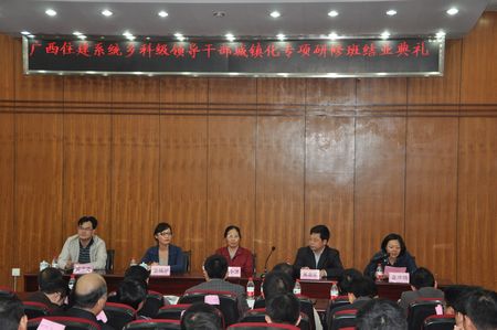 3月28日下午,经过为期8天紧张而充实的理论学习和参观考察,由自治区住房和城乡建设厅主办,我校承办的2013年广西住房城乡建设系统乡科级领导干部城镇化专项研修班在屏风校区9501教室隆重举行结业典礼。自治区住房和城乡建设厅副巡视员、机关党委书记王小波,我校副校长吴志强,自治区住房和城乡建设厅人事教育处副处长甘梅华,自治区住房和城乡建设厅培训中心(广西建设执业资格注册中心)副主任曾全方等出席结业典礼。研修班全体学员近150人参加结业典礼。