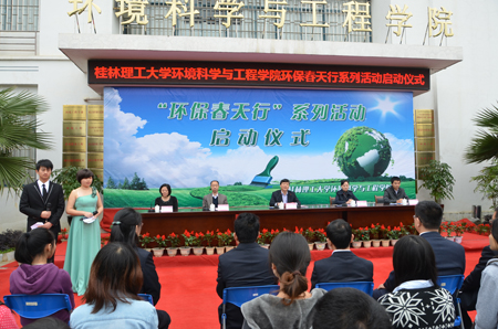 解庆林校长首先致辞,他指出,举行“环保春天行”系列活动意义深远,并号召全校师生从自身做起,从小事做起,用实际行动保护地球环境。桂林团市委副书记魏艳对活动的启动致贺辞。广西环境保护厅宣教中心为本次活动提供了一千多份宣传材料,环境学院也制作并发放了校园环保手册。