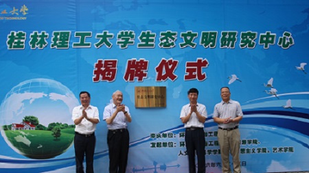 6月25日上午,beat365手机版官网入口生态文明研究中心在屏风校区正式揭牌成立,中国科学院袁道先院士、广西人力资源和社会保障厅蒋劼副厅长、学校校长解庆林教授、副校长王敦球教授共同为研究中心揭牌。