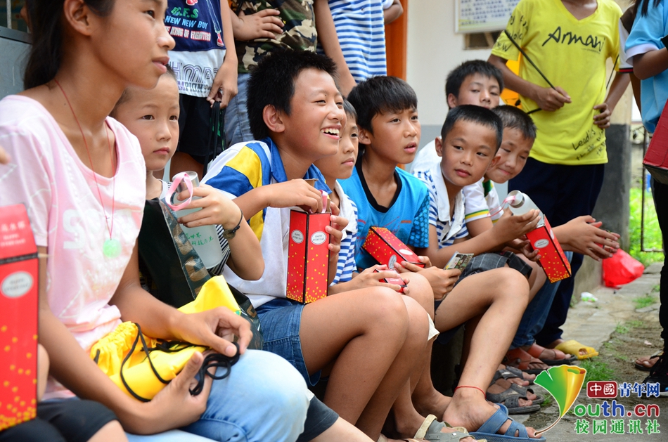 10 最后,同学们向孩子们送上了之前准备的环保袋、图书、玩具等小礼物。山村里的孩子似乎很容易就能得到满足,简简单单的礼物便能让他们脸上洋溢出幸福的笑容。
