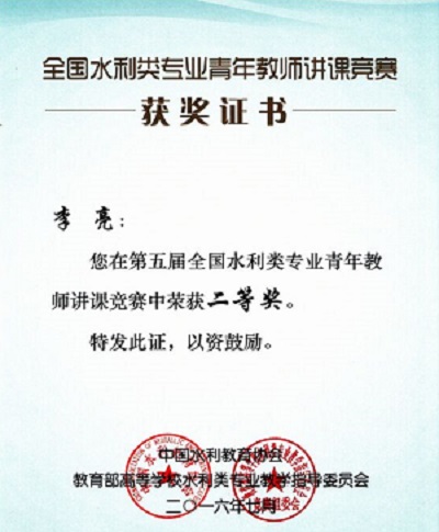 2016年7月25-28日,第五届全国高校水利类青年教师讲课竞赛暨教育部水利类教指委水文与水资源工程专业建设指导组全体委员(扩大)会议兰州大学召开,我院李亮老师在讲课竞赛中获“二等奖”。