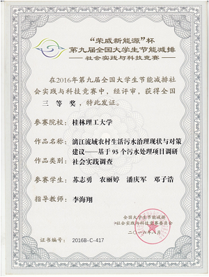 日前,教育部高等教育司主办并委托教育部高等学校能源动力学科教学指导委员会举办的“第九届全国大学生节能减排社会实践与科技竞赛”比赛结果揭晓。我校李海翔老师指导、苏志勇等同学参与的《漓江流域农村生活污水治理现状与对策建议——基于95个污水处理项目调研》荣获社会实践类三等奖。本次比赛在江苏大学举行,大赛得到300所高校积极参与,共计2839件有效作品成功申报,参与高校数和作品申报数量均创历史新高。