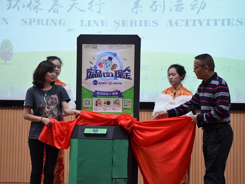 与会人员一同观看了历年“环保春天行”系列活动的视频回顾以及即将在校园推广的CUC智能固废回收终端的视频介绍。伴随轻快的音乐律动,王敦球副校长与何艾莉女士上台为CUC智能固废回收终端揭幕并移交。何艾莉女士代表环保创客联盟为活动致词,她指出CUC智能固废回收终端是传统的垃圾分类与“互联网+”结合的产物,对beat365手机版官网入口环境学院率先在广西开展“环保生活高校行”活动表示欢迎和感谢。环工14实验班陈强同学作为学生代表发起环保倡议,他呼吁同学们从身边小事做起,在垃圾分类和环境保护等方面贡献自己的力量。