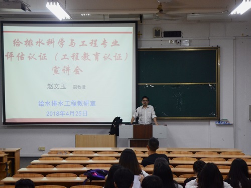 我院于2018年4月底在雁山校区举行了给排水科学与工程专业评估认证宣讲会。2016、2017级给排水专业全体学生参加了会议,会议由赵文玉副教授主讲。