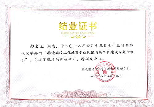 为保证我院给排水科学与工程专业评估认证工作顺利进行,4月14日-4月15日给水排水工程教研室赵文玉老师赴西安参加由高教国培(北京)教育科技研究院举办的“推进高校工程教育专业认证与新工科建设专题研修班”。