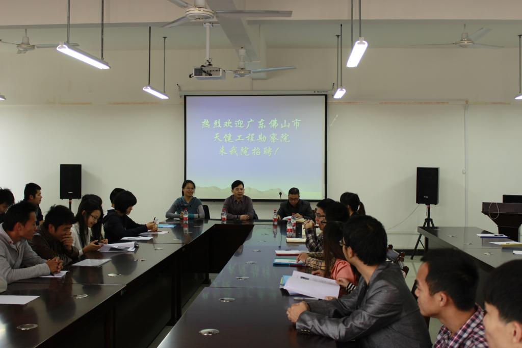 应我院水文教研室邀请,2018年11月25日上午,广东佛山市天健工程勘察院蔡院长和邱副院长一行到我院专场招聘并做就业创业讲座,学院党委副书记郝文佳、水文教研室负责人在雁山12407会议室热情接待了客人一行。