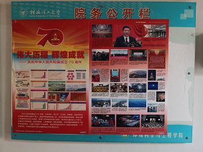 为积极响应学校“关于做好庆祝中华人民共和国成立70周年氛围营造工作的通知”, 九月下旬,我院在雁山校区萃华楼宣传栏张贴了“伟大历程,辉煌成就”宣传海报,同时在LED电子显示屏上循环播放“热烈庆祝新中国成立70周年”“不忘初心,砥砺奋进,以优异成绩迎接新中国成立70周年”等标语。为国庆节的到来营造了良好的氛围。