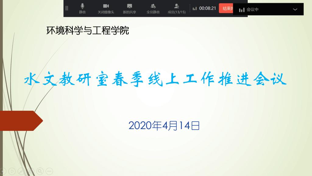 4月14日下午,我院水文学与水资源工程专业召开春季线上工作推进会议,会议由水文教研室主任张帅普老师主持,教研室全部教师参加。