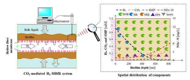 近日,我院博士研究生蒋敏敏在张学洪教授团队的指导下,在氢自养反硝化领域取得重要进展:设计了一套以CO2作为无机碳源和控制pH值的氢基质生物膜反应器(CO2 source H2-based MBfR)用于处理地下水中的硝酸盐污染,并建立了数学模型对生物膜内的微生物代谢过程机理进行了原位解析。相关研究成果以标题“New insight into CO2-mediated denitrification process in H2-based membrane biofilm reactor: An experimental and modeling study”发表于环境领域国际顶级学术期刊《Water Research》(一区Top,2019年影响因子9.13)。