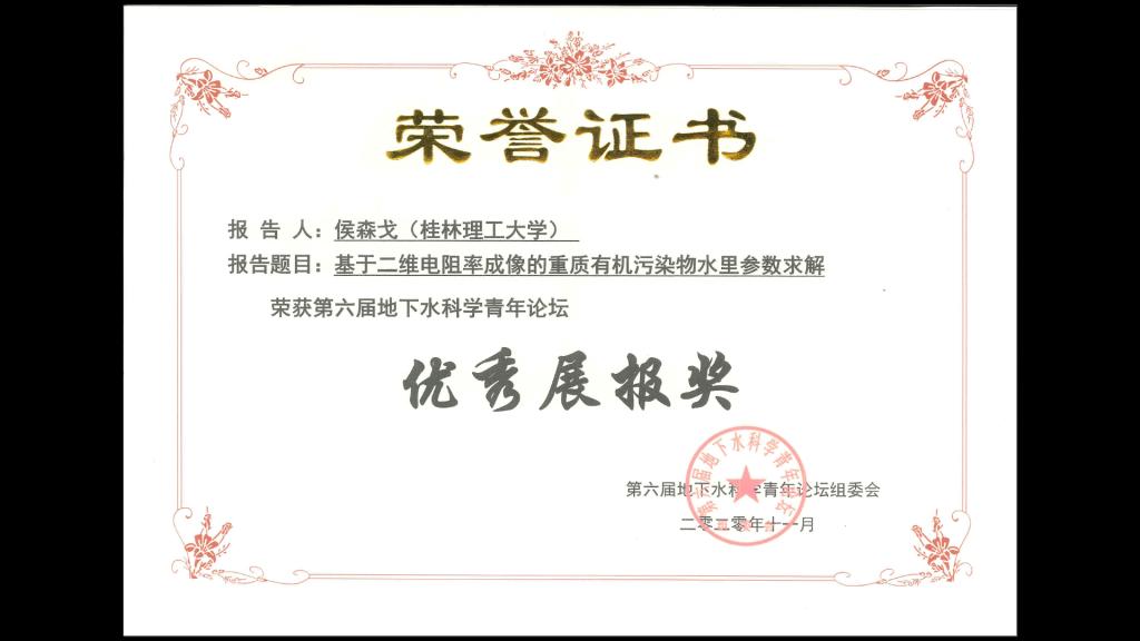我院研究生李培华和侯森戈参加于2020年11月在成都举行的第六届地下水科学青年论坛, 两位研究生均在研究生专场作了学术报告, 并做了展报交流, 侯森戈荣获”优秀展报奖”(指导老师: 刘汉乐)。