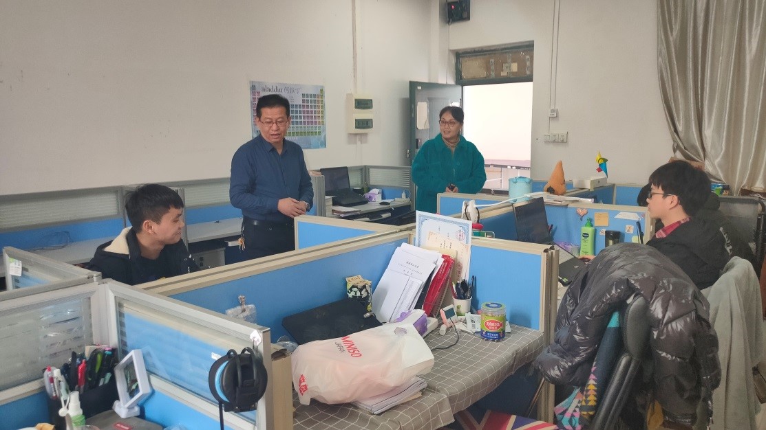 姜书记等一行人首先走访了各学生工作间,检查房间消防设施配置、安全用电、违章电器使用、卫生等情况,并对防范消防安全问题进行了重点指导。随后走访各实验室,在与实验室师生交流中,姜书记及两位老师指出了各实验室安全工作的不足和改进措施,并肯定了大家在科学研究中付出的努力,鼓励他们继续努力,争取为学院为学校再添新成果。