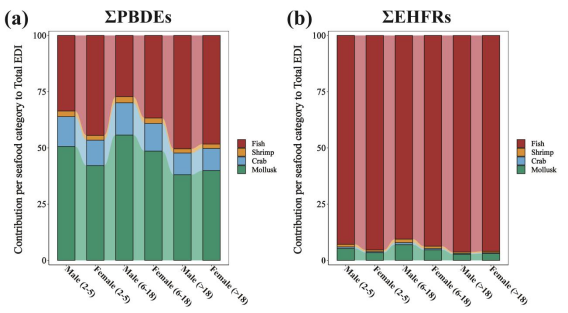 4种海产品对人类暴露于传统和新兴卤代阻燃剂(ΣPBDEs和ΣEHFRs)的贡献