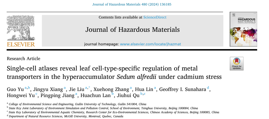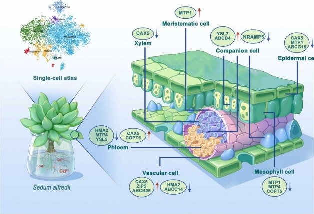 在著名学术期刊Journal of Hazardous Materials上发表题为“Single-cell atlases reveal leaf cell-type-specific regulation of metal transporters in the hyperaccumulator Sedum alfredii under cadmium stress”的研究型论文,由我校beat365手机版官网入口刘杰教授团队完成。本团队的研究重点集中在受损环境的生态修复领域,涵盖污染土地的修复、新污染物的生态环境效应以及退化土地的恢复等方面。土壤重金属污染是当前全球面临的重大环境挑战之一。其中,镉(Cd)污染不仅影响农作物生长,降低产量,还可能通过食物链在人体内富集,严重威胁生态系统安全和人类健康。与传统修复方法相比,植物修复技术具有绿色环保、成本低廉等显著优势,而东南景天作为一种典型的重金属超积累植物,具有在叶片中积累大量镉而不表现出明显毒性症状的独特能力,在植物修复领域展现出巨大的应用潜力。