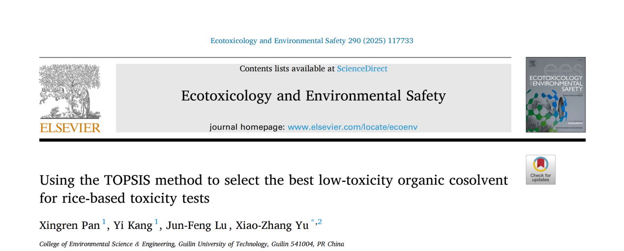 近日,在国际著名学术期刊Ecotoxicology and Environmental Safety上发表了题为“Using the TOPSIS method to select the best low-toxicity organic cosolvent for rice-based toxicity tests”的研究型论文,由我校beat365手机版官网入口于晓章教授团队完成。我校潘星任、康艺为论文共同第一作者。该研究在优化植物毒理学试验条件、提升环境风险评估准确性方面取得了重要进展。