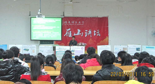 曹建华研究员作了题为“岩溶地质与生态环境”的报告。曹建华研究员结合自己多年的研究,讲解了碳酸盐岩在地质中的重要性,对碳酸盐岩和生物之间的关系、岩溶地质对生态环境产生影响的机理进行了阐释。他还以精彩的PPT向大家展示了世界、中国以及广西岩溶的分布情况和形形色色的岩溶景观,并以广西的实际案例验证他前面提出的理论。最后,他对岩溶石漠化综合治理提出了建议。曹建华研究员以新颖的研究思路、严谨的科学精神、广博的数据信息,为与会师生奉献了一次精彩的学术报告和科普教育。