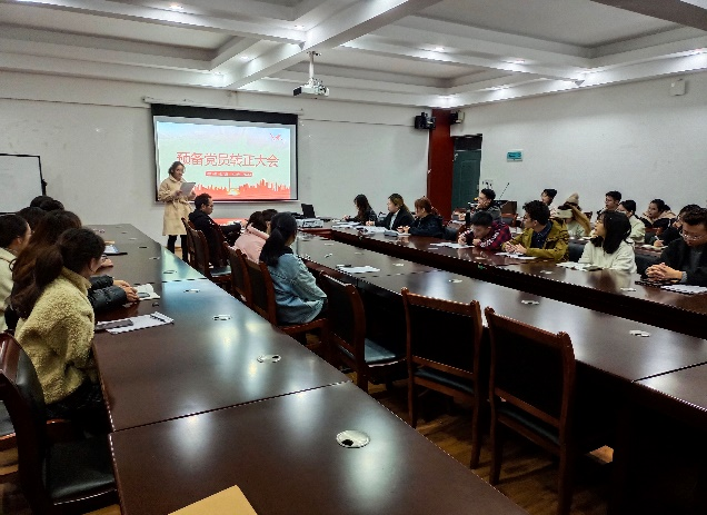 会议伊始,党支部书记岑韫同志向大家宣读预备党员转正的流程和会议纪律,纪检委员宇晓凌同志汇报出席的党员人数,确定出席人数符合组织规定,并宣布会议正式开始。六名预备党员依次上台宣读《转正申请书》,表明自己的入党动机,汇报成为预备党员一年以来自己在工作、学习、生活方面的表现和进步,进行了深刻的总结。然后由预备期期间的联系人发表意见,联系人对各个预备党员的情况进行简单汇报,表扬优点,指出不足的地方并提出建议,说明其是否符合一名中国共产党正式党员的要求。每位预备党员的情况汇报结束后,由现场的正式党员对他们进行提问。最后经过现场正式党员进行无记名投票,会议同意李嘉伟、张宇玲、徐薇、徐赫姝、李秋虹、郭蒂洁正式成为一名共产党员。