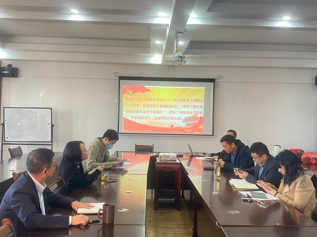 12月6日上午,我院在12407召开专题学习会议,学习《中共中央关于加强对“一把手”和领导班子监督的意见》《中共广西壮族自治区委员会关于加强对“一把手”和领导班子监督的实施意见》《粮食节约行动方案》等文件精神,学院全体在家党政领导参加会议,会议由学院党委副书记、纪委书记郝文佳主持。