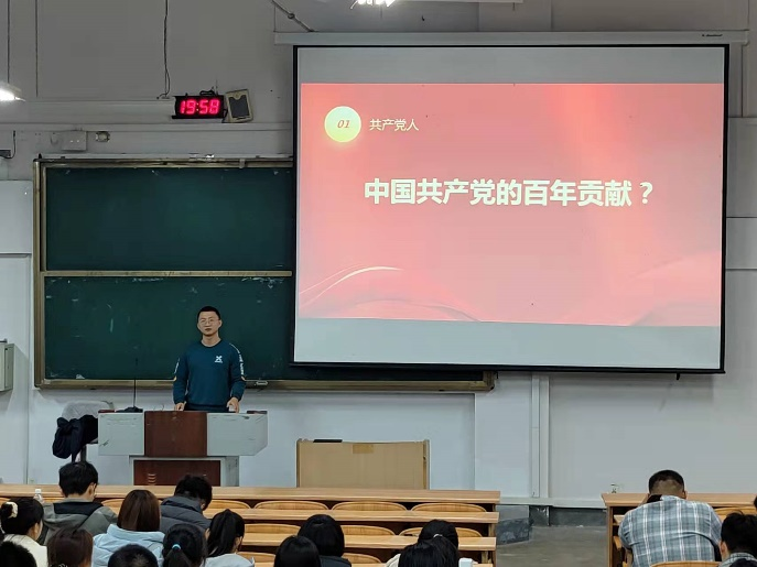 宣讲会开始之前,李学强以人民日报版《少年》激发出同学们的爱国爱党情怀,引出宣讲会主题“争做爱党新青年”。宣讲会上,李学强同志提到:“新时代青年应起到先锋模范作用,坚决维护中国共产党领导,在成长中贡献自我,在奉献中挥洒青春”。他指出具有崇高追求与使命担当,以身许党,以身报国,衷心为民,此为中国共产党人,并以李大钊、向馨予、邓中夏等革命先辈为例,教育我们在前进的道路上,要溯源起点,不能忘记为民族解放而奋斗的先驱们。最后,他以自身保研经历为例,为同学们树立起一个勇担责任的新青年形象。在宣讲会结束之际他谈到:未来属于青年,希望寄于青年,希望在坐各位能够把握当下,筑梦未来。
