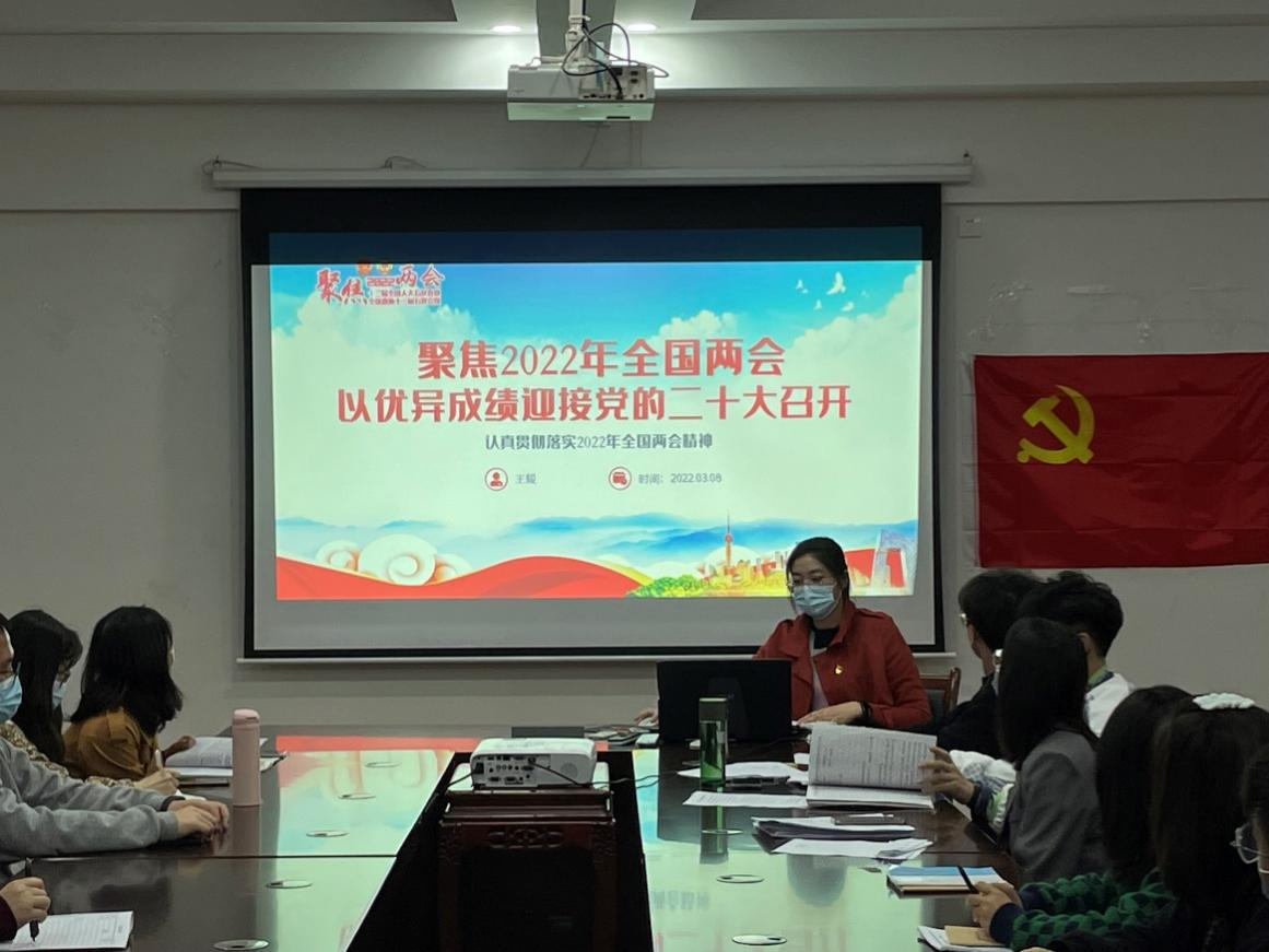 为了加强党员教育管理,发挥党员先锋模范作用。3月8日晚上,我院研究生二支部在雁山校区萃华楼12407会议室组织开展了关于“2022年全国两会精神”的主题党课。支部书记及支部全体党员同志参加会议,本次主题党课由支部书记王媛老师主持。