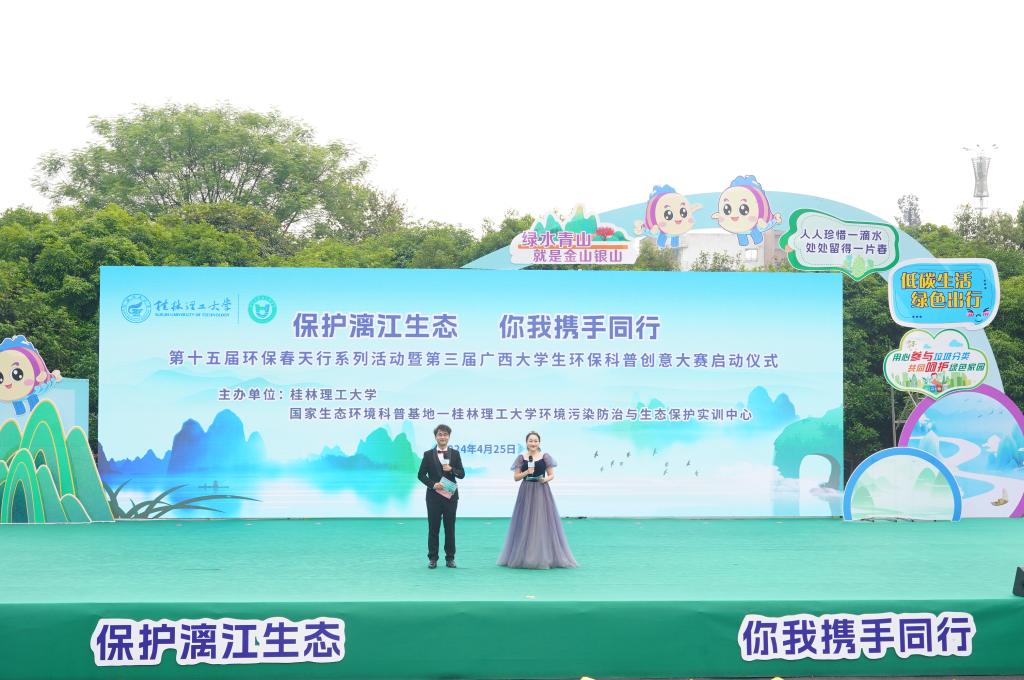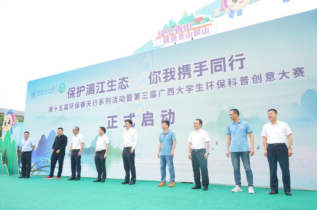 4月25日上午,在第三个桂林市“漓江保护日”到来之际,为深入贯彻落实习近平生态文明思想,提升广大青年学生环保意识,展现当代青年的环保担当与青春风采,由学校和国家生态环境科普基地—beat365手机版官网入口环境污染防治与生态保护实训中心主办的“保护漓江生态,你我携手同行”第十五届环保春天行系列活动暨第三届广西大学生环保科普创意大赛启动仪式在雁山校区举行。学校党委常委、副校长王磊出席活动并致辞,党委常委、宣传部部长叶昊,校长助理、党办校办法务办主任张成龙,广西环境科学学会秘书长王晓飞,桂林市生态环境局、兴安县生态环境局有关领导,各兄弟院校相关领导和嘉宾、学校相关职能部门负责人出席活动,广西大学生环保科普创意大赛参赛代表以及桂林市大埠中心校师生代表参加活动。