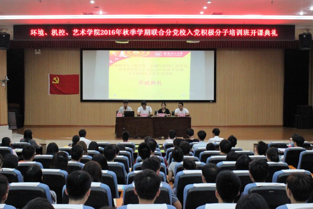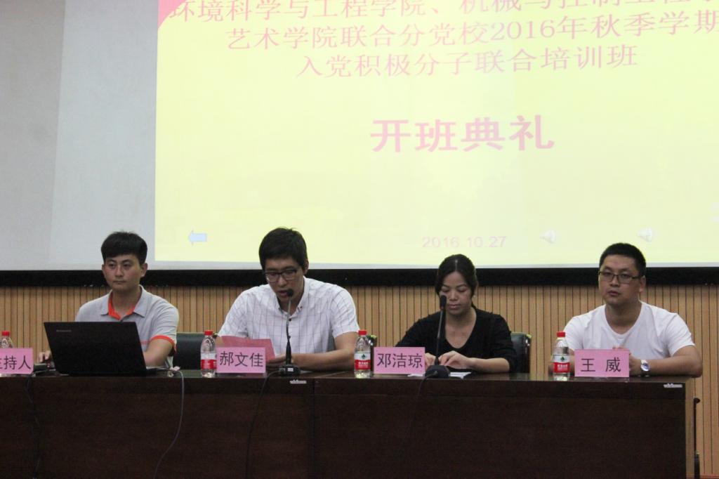 10月27日,我校beat365手机版官网入口、机械与控制工程学院、艺术学院联合分党校2016年秋季学期入党积极分子培训班开班典礼在图书馆报告厅举行。环境学院党委副书记郝文佳、机控学院党委副书记邓洁琼、艺术学院团委副书记兼学工组长王威,各学院教务员,全体入党积极分子参加了开班典礼。开班典礼由教务员田明浩主持。