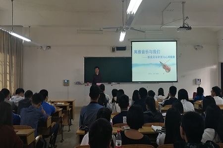 李老师首先为大家介绍“什么是高雅音乐”、“什么样的音乐算是高雅音乐”的问题,让同学们对“高雅音乐”有了全新的认识。紧接着,李老师与大家一起欣赏了古今中外知名的高雅音乐,进而谈到“音乐与我们的心理健康有着密切联系”,生动的形式无不吸引着在场同学的关注。