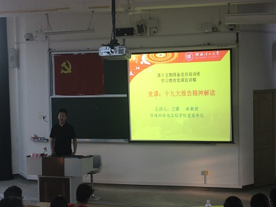 5月21日,我院党委书记王璐在惟实楼05308教室为我校第十五期学生预备党员培训班授课。本次党课主题为学习解读习近平同志在中国共产党第十九次全国代表大会报告,我院党校教务员夏晴老师及各分党校预备党员参与听课。